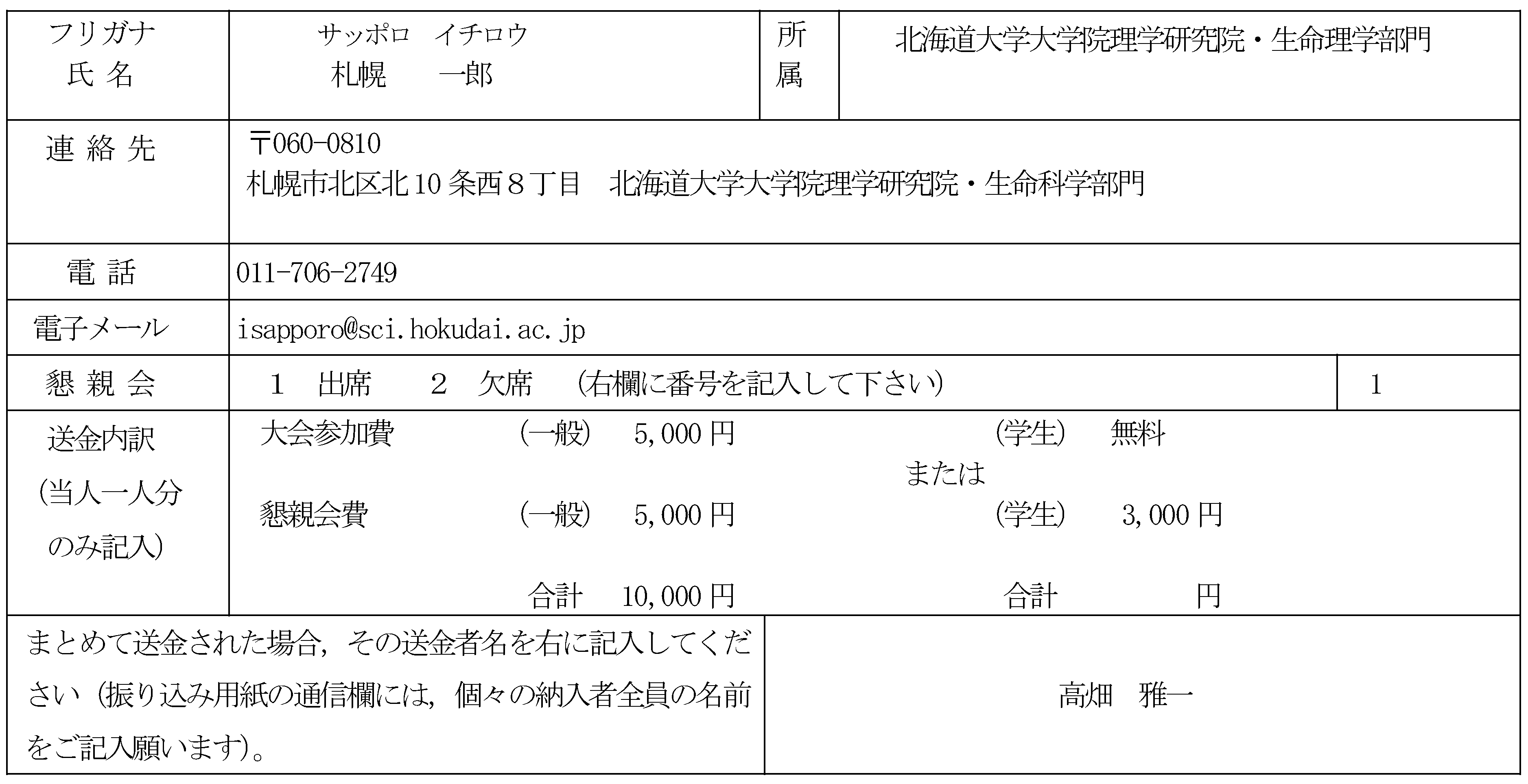 es.hokudai.ac.jpまでお送り下さい。なお,添付ファイル名は「氏名・所属等」にし、電子メールの件名欄には「札幌大会参加申し込み」と書いて下さい。