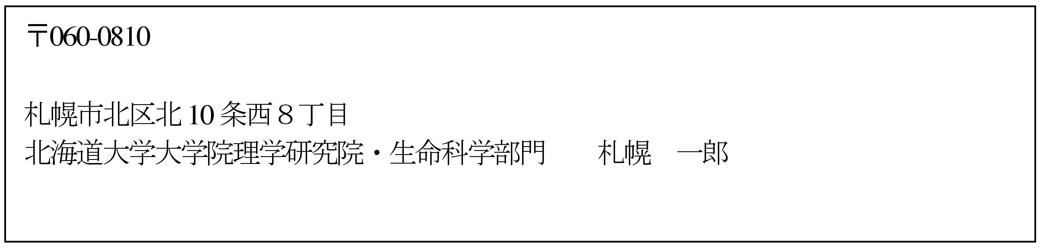 - 著者名はコンマで区切り,first name family name の順にフルネームで書いて下さい。名前と所属の間には改行を入れず,所属は省略形(Dept. Biol. Sci.など)で書いて下さい。違う所属の著者がいる場合,a,b,c…で区別して下さい。
