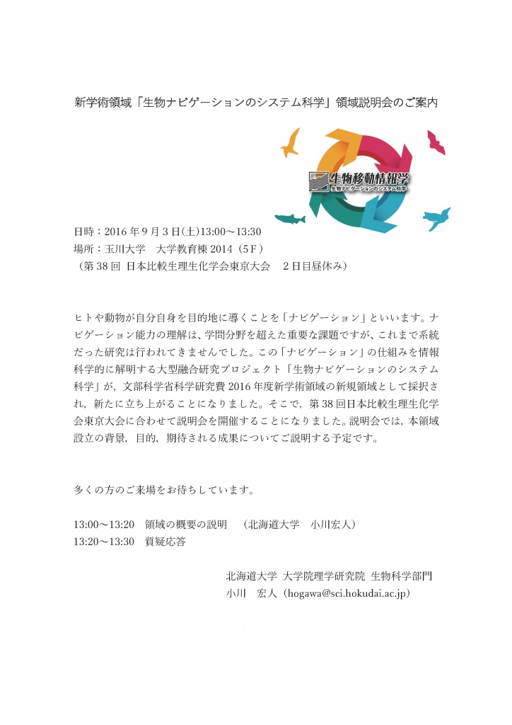 総会開始前の30分間(13:00-13:30)を使って、新学術領域「生物ナビゲーションのシステム科学」領域説明会を行います。【詳細はこちら】