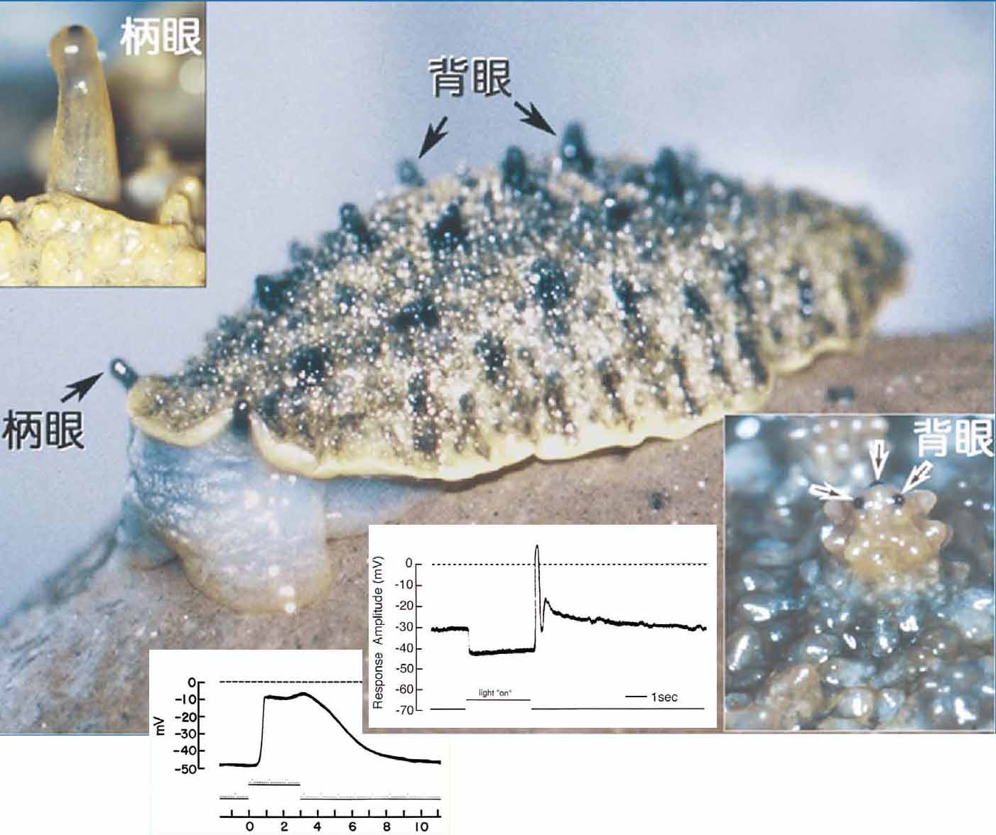 イソアワモチは不思議な動物で,全身で光をキャッチしている。海岸の干潮帯の岩場の上をゆったり這い回る。移動する方に伸ばした触角の先端に柄眼がある(左上図)。外套の要所に伸縮する担眼突起が塔のように立ち,そこで背眼が周囲を見張っている(右下図)。この2種の眼は黒い眼点として肉眼で認めることができる。さらに外表からは識別できないが体表全体の皮下組織に皮膚光覚細胞が夥しく散在する。背眼はユニークな脊椎動物型の眼で,網膜は繊毛型光受容細胞からなり,無脊椎動物では珍しい過分極性の光応答を示す(下中央図)。一方,背眼の中央部にあるレンズは光学的レンズであるとともに,感桿型光受容細胞で,脱分極性光応答を示し(下図),背眼は2つの異型の光受容細胞をもつ特異な眼である。