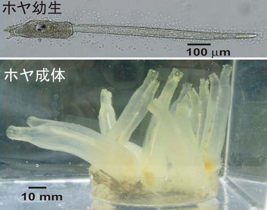 カタユウレイボヤは,脊椎動物と同じ脊索動物門に属し,成体の姿形から想像し難いが,その幼生はオタマジャクシ型形態を示す。