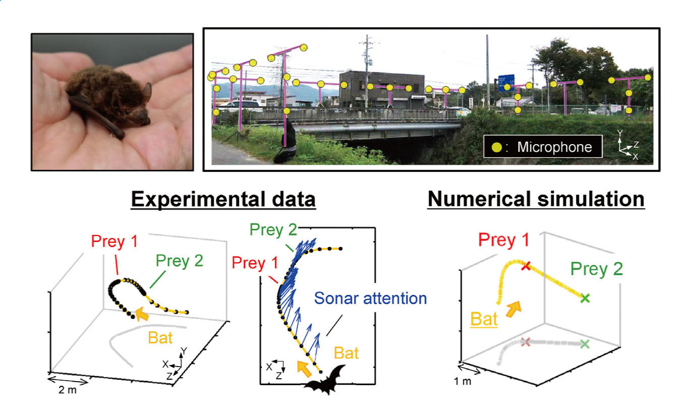 コウモリは超音波ソナーで獲物を検知する。日本に広く生息するアブラコウモリ(図左上)は,ユスリカ等の微小な飛翔昆虫を捕食している。彼らは大食漢で,一晩の採餌で体重が約20 % 増加した報告がある。さらに,採餌中の計測からは,1秒未満という非常に短い時間間隔で連続的に獲物を捕食する様子も観測されている。このとき,コウモリは目前の獲物のみに集中しているのだろうか。それとも,次の標的にも注意を分散させているのだろうか。